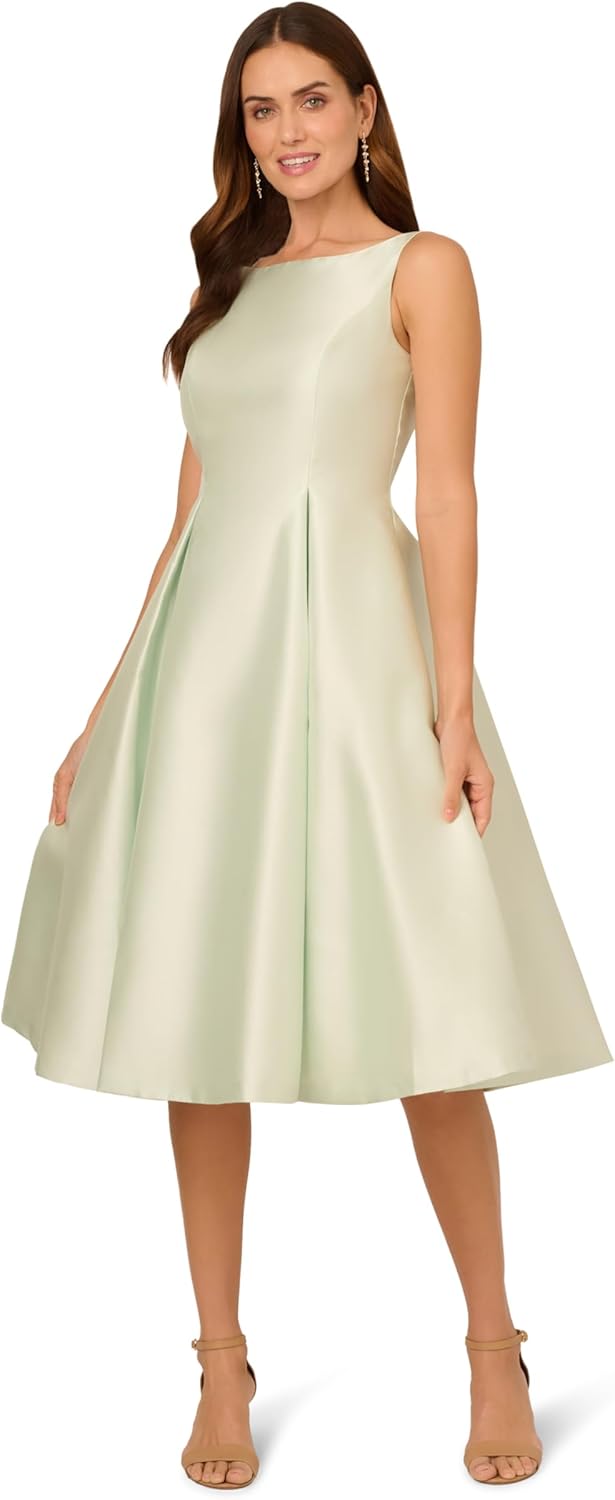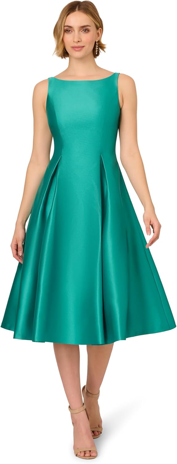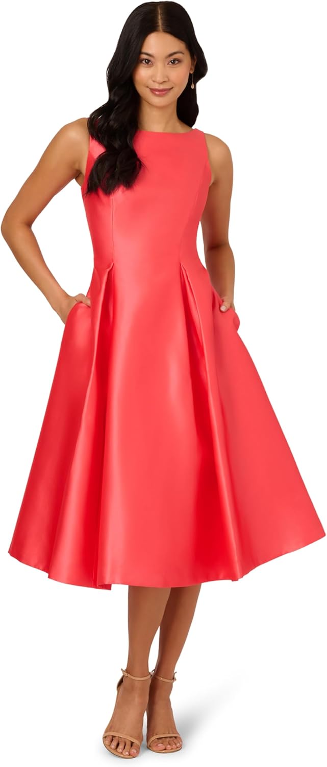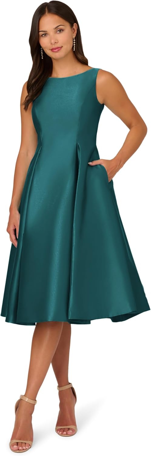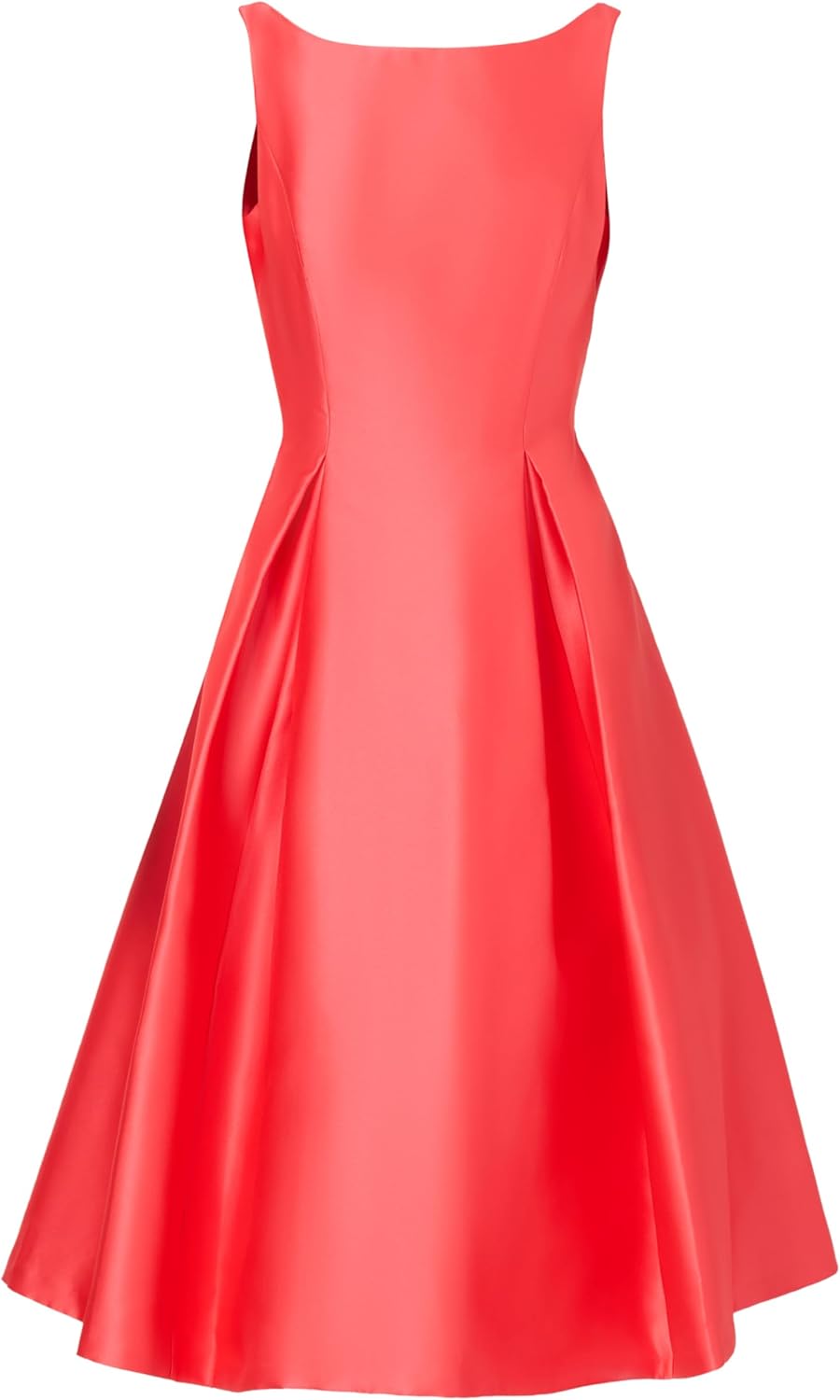 It does not get any more timeless or sophisticated than this mikado dress. This cocktail dress features a sleeveless fitted bodice, boat neckline, and a pleated flare skirt with pockets. A zipper closure and a deep v-back add a final touch to this semi-formal dress. Crafted from shiningmikado fabric, this fit and flare dress is a feminine style. Dressed up with bold accessories or streamline with simple details, this sleeveless dress is a versatile look youll love for years to come.