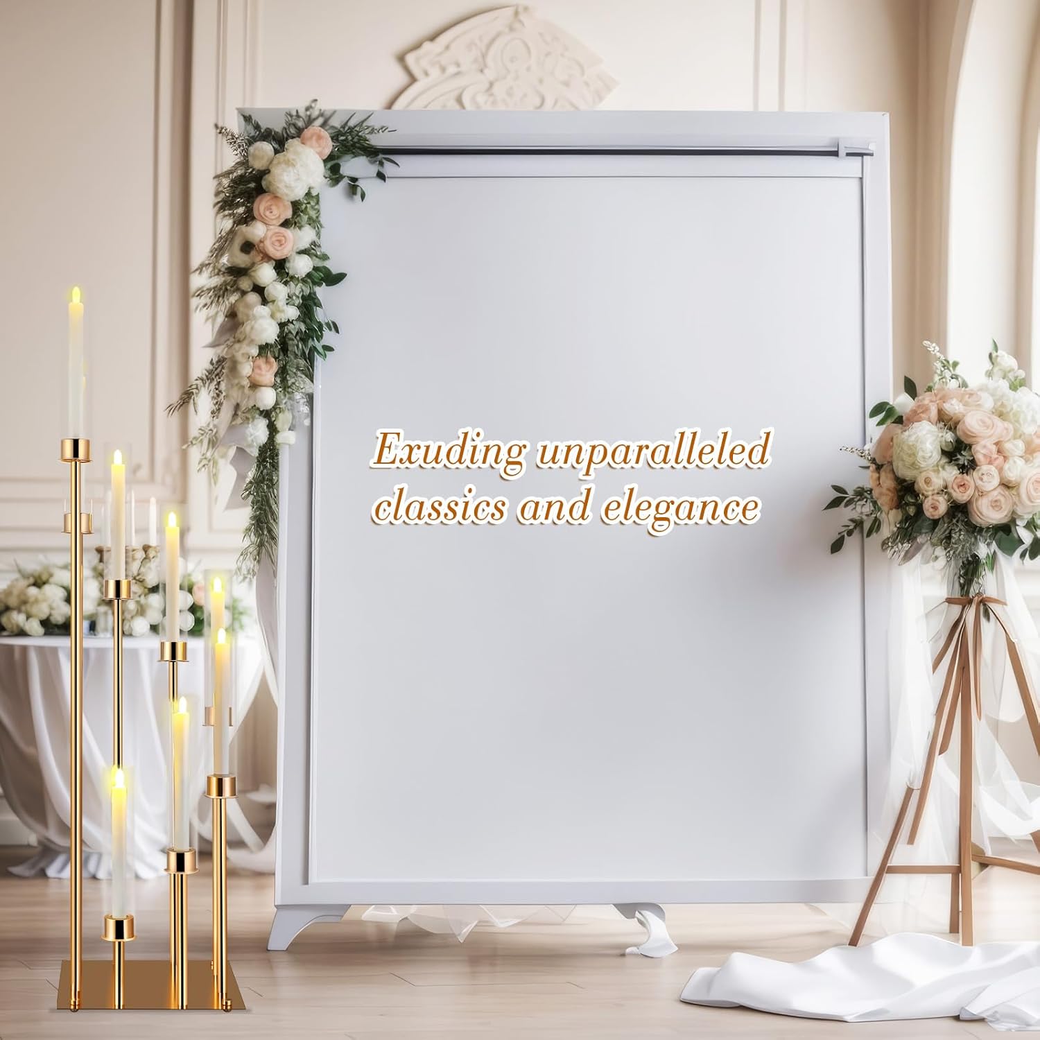 Features: The tall gold candelabra make a nice gift, bringing a touch of luxury and charm to home decorations. Not just an elegant addition to home decorations, but also great for wedding table decorations, events celebrations, and special dates. These candelabra holder centerpieces will create a warm and inviting atmosphere for your guests. Making it an addition to your event decorations. Specifications: Main color: gold Main material: electroplated gold, acrylic Size: Base: approx. 11 inches/ 28 cm Height: approx. 41.5 inch Package includes: 2 Sets gold candelabras Warm notes: Please allow slight deviation due to manual measurement. Please allow slight color differences due to different monitors. Only suitable for flameless candles. Not suitable for real candles, please remove the clear acrylic lampshade before using real burning candles