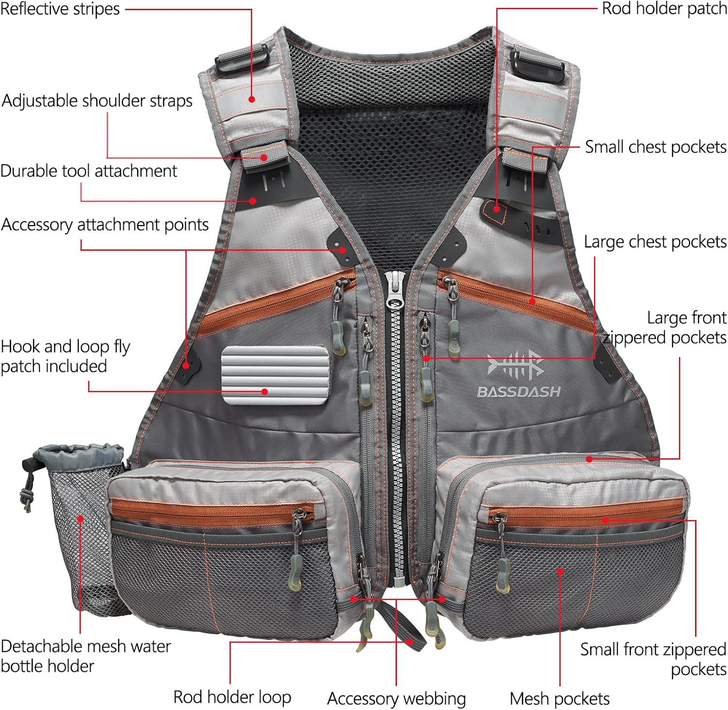 BASSDASH Fly Fishing Vest Adjustable Size with Detachable Water Bottle Holder for Men and Women FV07