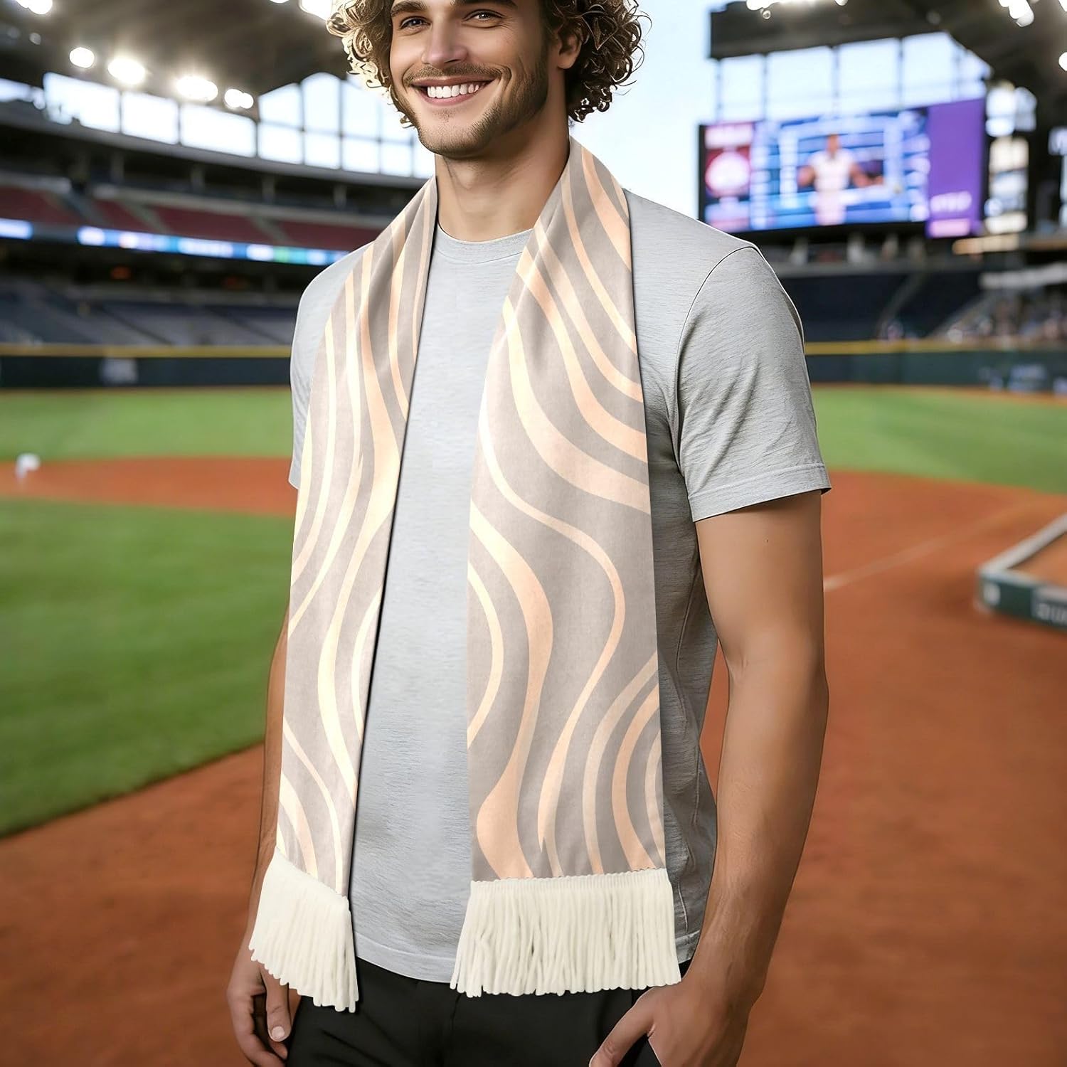Whether you are cheering from the stands or watching from the sidelines, the sports fan scarf is your go-to companion for every game day. Crafted from 100% polyester with a soft brushed texture, it feels smooth and comfortable against your skin, even during the most intense moments of the match.At 70 x 7 inches, this soccer scarf is long enough to wave proudly in the air, wrap around your neck, or hold up as a banner with your favorite slogan. The generous 60 x 7 inch print area ensures your graphics and messages stand out with vivid, fade-resistant colors that hold up wash after wash.Sweat happens when the excitement builds. The quick dry fan towel scarf absorbs moisture fast and dries in no time, so you can stay focused on the game without discomfort. Stylish fringe ends measuring 3.7 inches add a sporty finish and a satisfying swoosh when you wave it in celebration. in classic black and white, this scarf pairs effortlessly with virtually any team colors or custom design. It makes a thoughtful gift for birthdays, holidays, or any occasion for the sports lover in your life.Care is simple: machine wash in warm water under 40C, no bleach, no dry cleaning. Hand washing and gentle ironing are also fine.Bring it to soccer matches, fan meetups, school events, or community rallies. Cheer louder, stay comfortable, and show your passion with every wave.