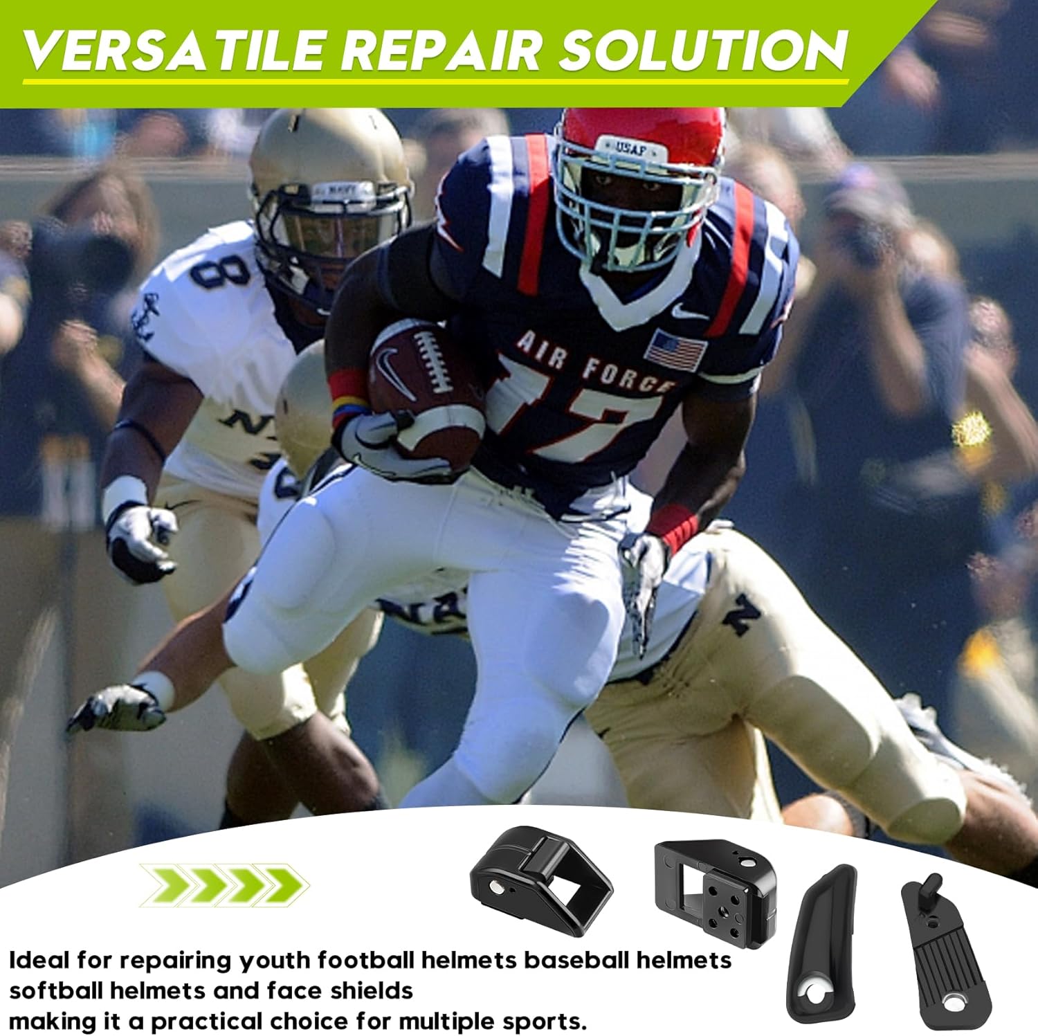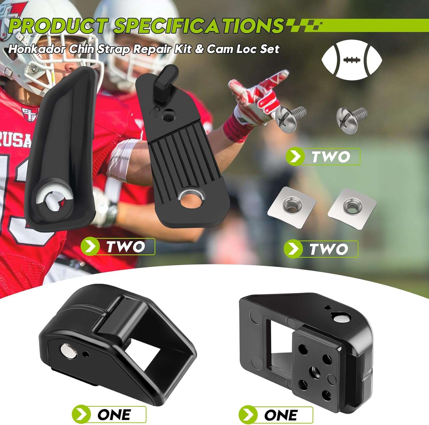Complete Repair Kit Included - This Honkador set includes 1 Loc Chinstrap Fastener Kit and 1 Chin Strap Cam Loc Housing Set (2-Pack), providing all the parts needed to repair and secure your helmet straps. Compatible with Riddell SpeedFlex - Specifically designed to fit Riddell SpeedFlex football helmets, ensuring a perfect match for stability, safety, and performance. Durable & Secure Design - Features a hard cup cap strap and high-quality fastener that withstand intense gameplay, offering reliable protection for your chin and head. Versatile Repair Solution - Ideal for repairing youth football helmets, baseball helmets, softball helmets, and face shields, making it a practical choice for multiple sports. Convenient 2-Pack Value - Includes two Cam Loc Housing Sets and fasteners, ensuring you always have spare parts for quick repairs or replacements.
