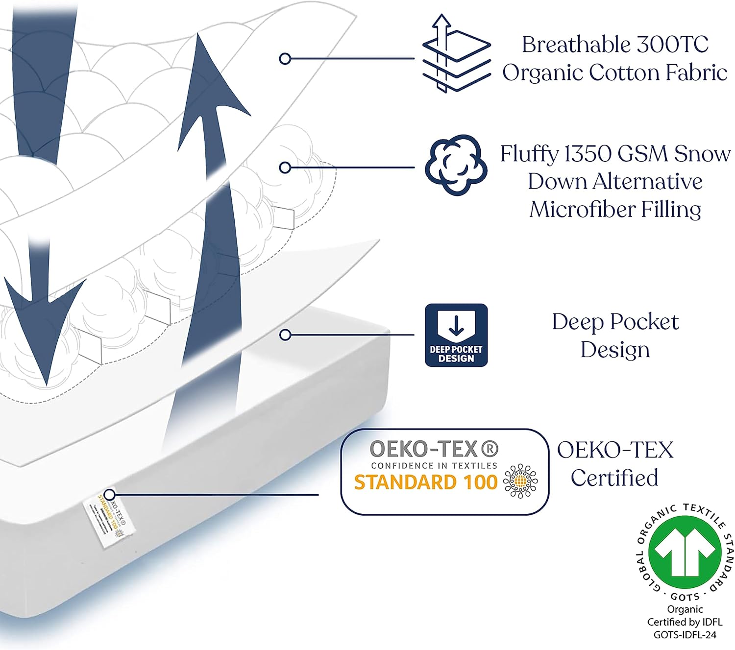 | Other Special Features of the Product | 1350 GSM Snow Down Alternative Fill, Breathable & Soft Mattress Pad, Deep Pocket 20", GOTS Certified Organic Cotton Cover, Pluffy & Soft |