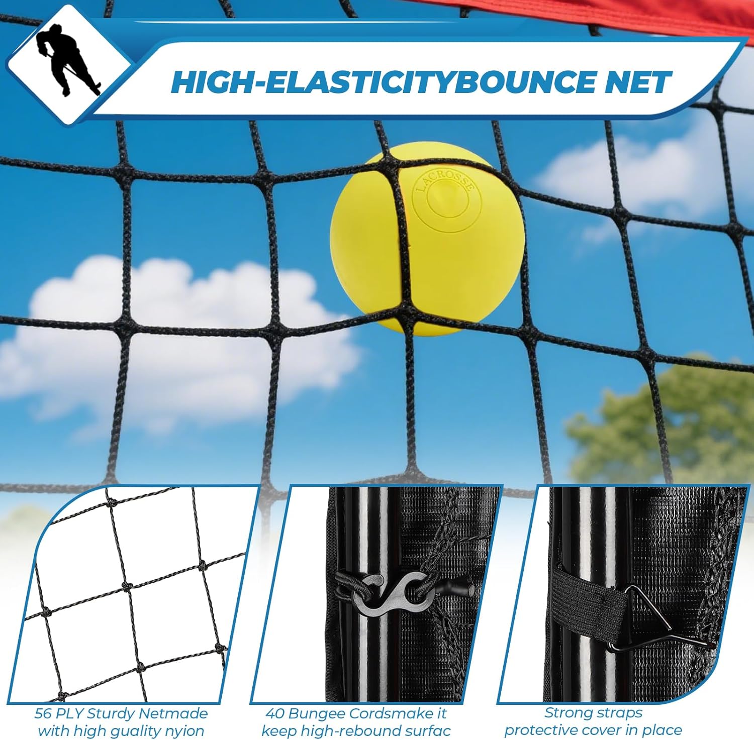 | Included Components | 1 portable travel bag and 40 elastic cords, 4 ground stakes, 2 sandbags,, 4x7 ft Lacrosse Bounce Back Net Volleyball Rebounder Net, a precision throwing target net, a rebound net, a red target band |