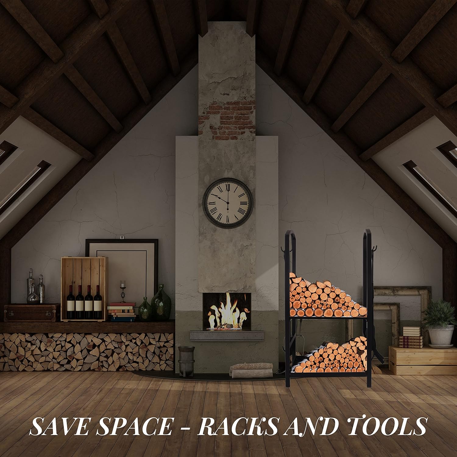 This 4-tool mantel handle handles all your everyday uses with just one product. But this fireplace wood shelf with tool set won't take up space in your home.Product size: 74*43*30CMPacking size: 78*33*8.5CMWeight: 9.8kgPackage List:Hooks for hooksBroomsShovelsPliers