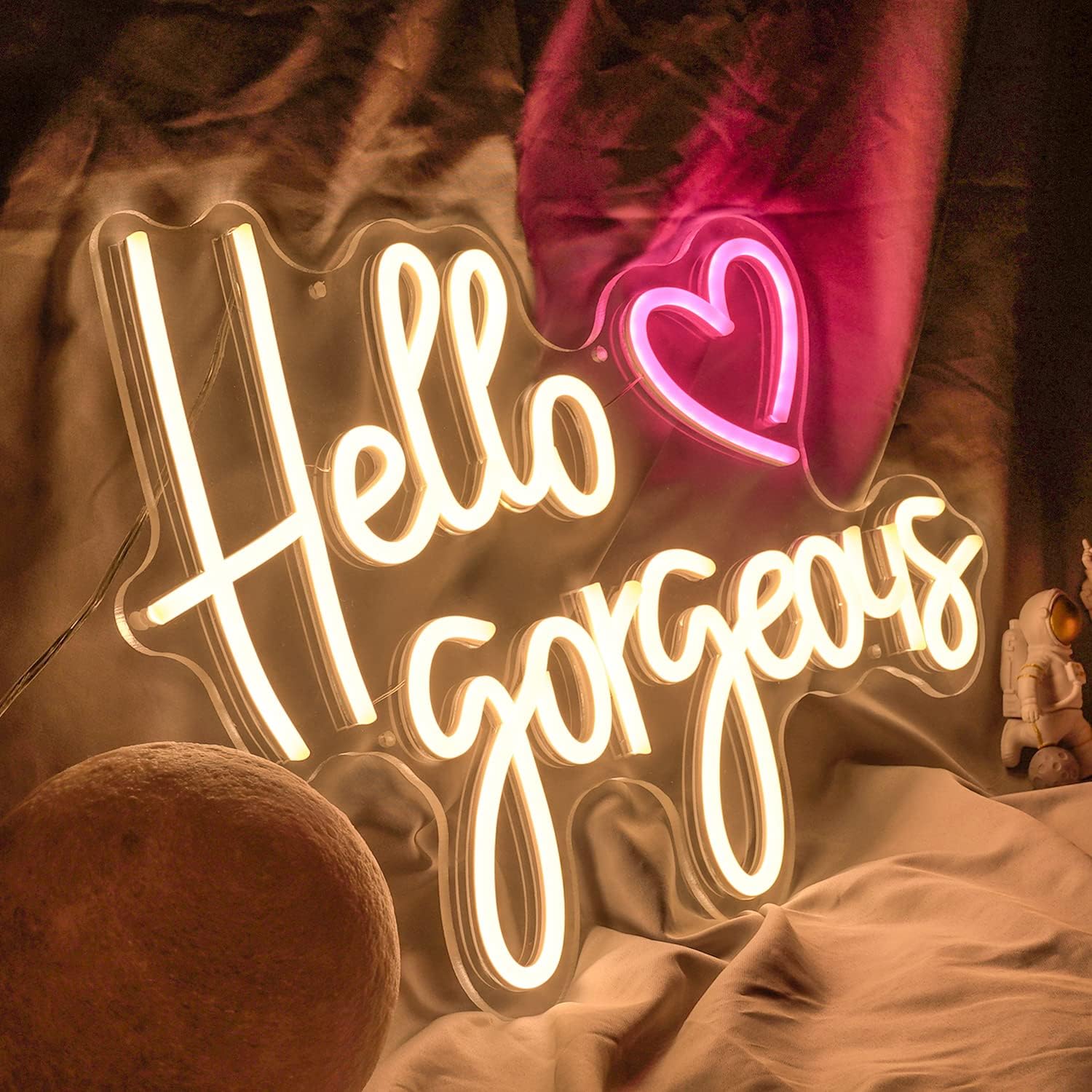 Hello Gorgeous neon sign use LED neon strip, a brilliant neon lights show across your home or garden. . Bring the fun and excitement of neon light with 3D art will increase the atmosphere of your bedroom and living room. Add romantic for the man cave, beer bar, pub, restaurant, recreation game room. An ideal eye-catching to your aesthetic room decor make your simple life more colorful and interesting.
