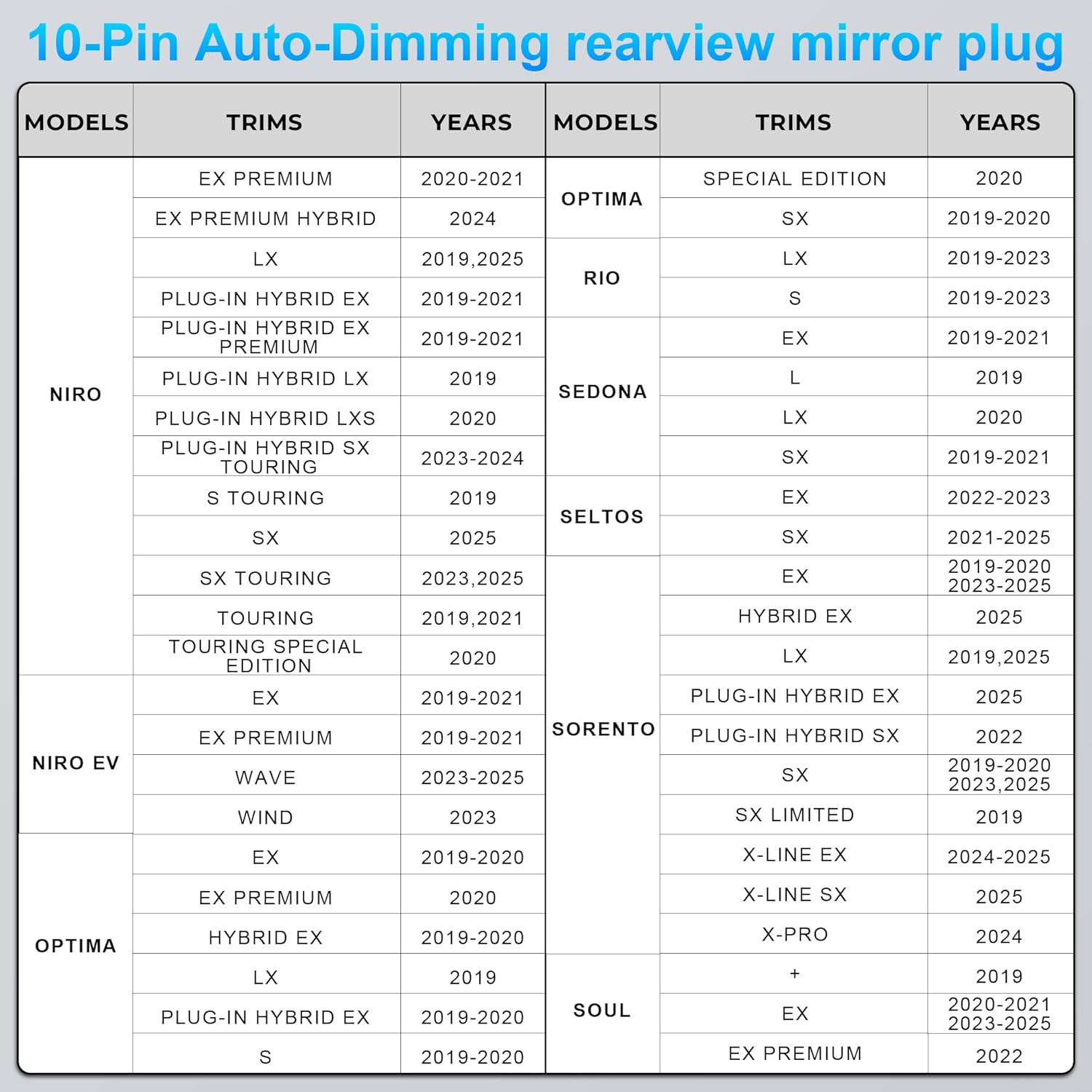| Compatible Devices | Hyundai, Kia (select models), GPS Radar Mirror Camera Dash Cam (select models) |