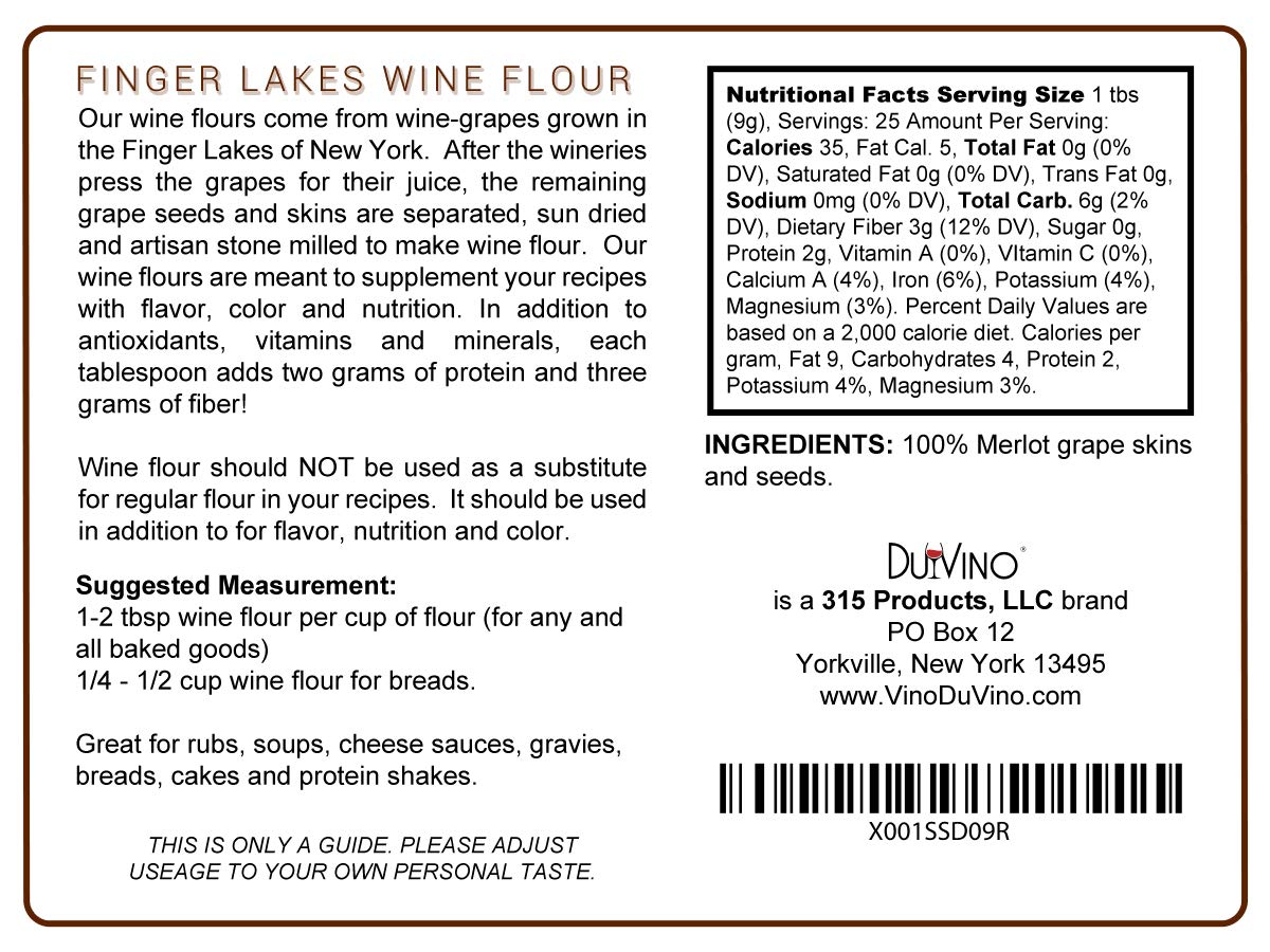 DRINK YOUR WINE AND EAT IT TOO!Now you can add nutrition, flavor and color to any recipe with innovative wine flour by DU VINO. Our wine flour is made from leftover grape skins and seeds after the wineries harvest and press the wine-grapes for their juice. Instead of discarding the remaining pomace (skins and seeds), we recycle the nutrient rich by-product to make a delicious, edible wine flour! The flour is made by sun drying, sorting, cold pressing and then stone milling the grape skins and seeds into a delicious flour. The drying process removes the alcohol but preserves the color, flavors and aromas made from the fermentation. Perfect for using in your favorite recipes!Our flour comes from the wine-grapes grown in the beautiful Finger Lakes Wine Region of New York and is gluten-free, sodium-free, low carb and high in protein, fiber, antioxidants, vitamins and minerals. The flavors mimic the fermented grapes they come from tasting like wine, and taking the colorful hues from the grape- purple flour for red grapes and gold for white grapes.WINE FLOUR IS NOT A SUBSTITUTION FOR REGULAR FLOUR!Wine flour should be used as a supplement to enhance your recipe with flavor, nutrition and color. It’s water absorbent, so you just have to use a little bit to get the color, flavor and nutrition. We recommend substituting one or two tablespoons of wine flour to a cup of flour in a recipe. It can also be used when thickening sauces or in rubs.When pairing wine flour with your recipes it’s a good idea to remember the rules of pairing wine with your food- you would make steak rub with a red wine flour or a turkey gravy with a white wine flour to best bring out the flavors of your recipes.MERLOT- Anything made with strawberries, steak, stews, red sauces, meatballs, meatloaf, etc, cake, pancakes.