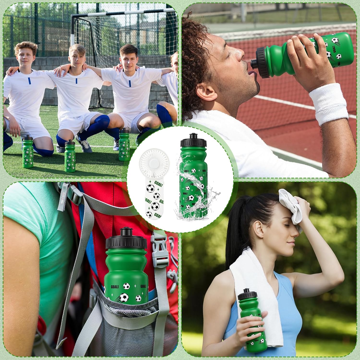24 Pack Sport Supply with Water Bottle Handheld Fan - Portable Sports Favors 20 oz Plastic Squeeze Water Bottles for Training, Team Gifts, Match, Battery Not Included Practical sport gift: This sports gift set is suitable for various outdoor sports, including ball games, and is also ideal for camping, hiking, watching games, office use, or home apply. The water bottle and fan work together to meet both hydration and cooling needs. Soccerball themed: This sports supply features a striking soccerball-themed design, exuding a sporty vibe. It blends seamlessly into various settings, including team training, school events, sports parties, and soccerball-themed parties, making it a favorite among sports enthusiasts. Specifications: Material: PP, ABS Light color: white, green Bottle size: 8.3 x 2.8 inches Fan size: 5.9 x 2.6 x 1.5 inches Package: 12 x Sport bottles 12 x Portable fans Warm notes: Please allow slight errors in size due to manual measurement. Due to different angles of light and shadow effects, please allow a little color difference with the pattern
