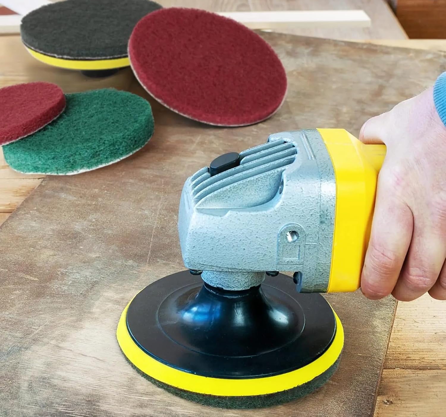 Product detail descriptionTIME SAVING CLEANING: Use with your hook and loop backing pad to quickly and easily remove soap scum, hard water stains, mineral deposits and other grime, effectively white cutting down cleaning time.PERFECT FOR SHOWERS AND BATHTUBS: Great for showers, tubs, tile, grout and any other hard surface that needs scrubbing.SCRUB PADS FIRMLY ATTACHED : scouring pads are backed with a layer of fleece fabric, so they can be firmly attached to the hook and loop attachment, and will NOT become loose when in use.Products include4" red scouring pads*11wool buffing pads*34” thickening scrub pads*3a long 6 inch reach attachment*14 inch hook and loop backing pad*1M10 adapter*1.Drill not included.