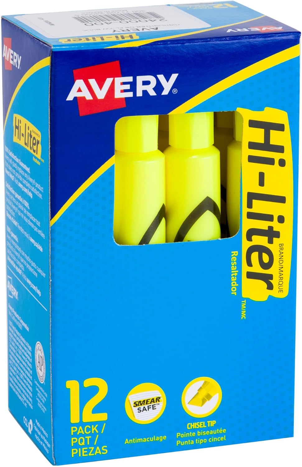 Bring attention to essential words and phrases with Avery Hi-Liter Desk-Style Highlighters. The molded chisel tip of these highlighters gives you the precision to highlight or underline text in an eye-catching fluorescent yellow ink. Keep your documents in pristine condition with a smear-safe highlighter ink that doesn't bleed through most paper and won't smudge pen, marker or inkjet inks. Built to last, these highlighters have a resilient tip that won't fray and a comfortable faceted barrel with a long-lasting ink supply. The improved ink formula ensures that highlighters can be left uncapped for up to one week without drying out. Don't worry about getting highlighter ink onto your hands; the water-based ink is easy to wash from skin and is ACMI-certified, making these Avery highlighters suitable for kids and classroom use. A must-have item for back to school, home and office use, Fluorescent Yellow highlighters are perfect for highlighting textbooks, sorting out budgets, test prep, color-coding your planner, and is a great addition to any list of school supplies or bullet journal supplies. Value Pack of 200 highlighters.