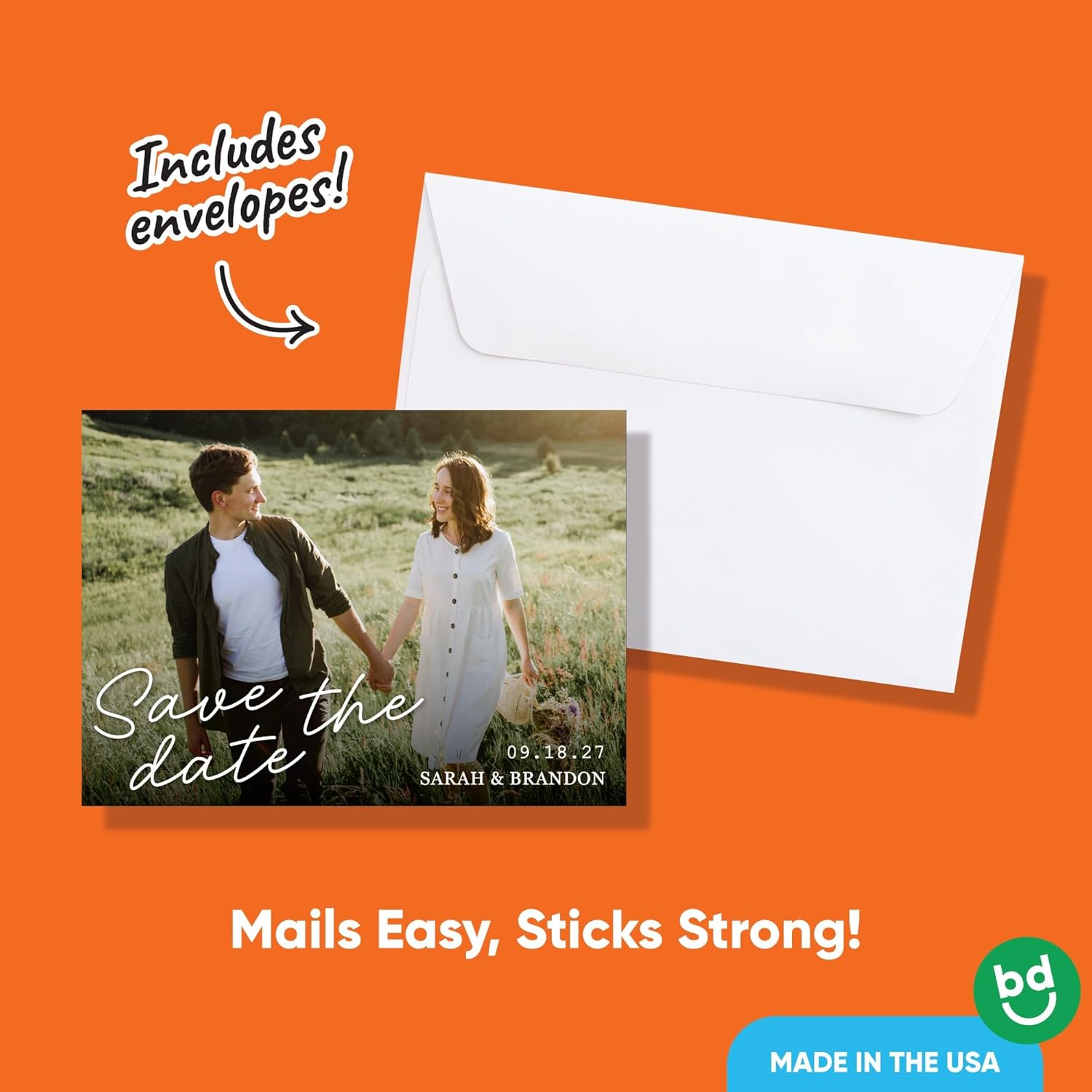 Give your guests a wedding reminder they will actually keep with Save the Date Magnet Cards. Available in sets of 24 or 72, horizontal or vertical, with white A2 envelopes, these wedding magnet postcards turn your favorite engagement photo into a personalized keepsake. Magnetic save the dates are perfect for destination weddings since they stay visible on fridges long after they are received. Simply upload your photo and details, pick your preferred orientation layout, and we will handle the rest. Each card features vibrant printing and durable magnet backing, all made in the USA.