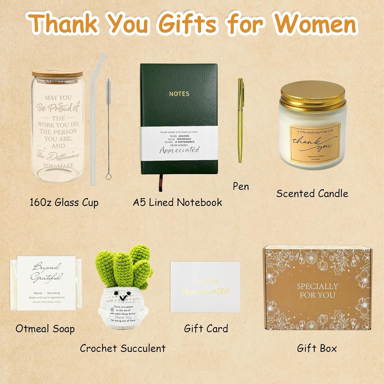 | Included Components | crochet succulent, glass cup, pen, notebook, thank you card, oatmeal soap, scented candle |