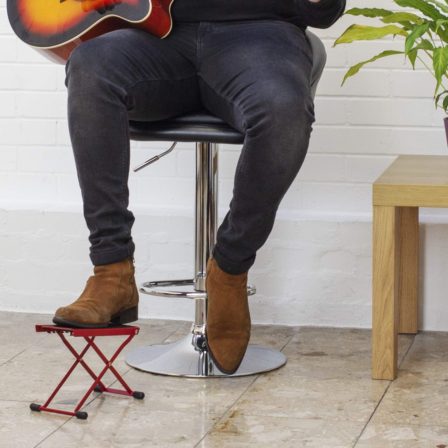 Product Description This foot stool is designed to provide the correct posture when playing guitar. It can be easily adjusted to a selection of different heights which makes it suitable for any age, children and adults alike. The angle is also adjustable for optimum playing position, to ensure that you hold the right posture throughout your performance. The X-frame legs are strong and robust meaning that the stand is stable. Rubber feet ensure that the footstool will not slip mid-performance and also protects the floor from scratches. A very useful accessory often used with classical guitars to help hold the guitar in a comfortable position. Item Specifications - Weight: 0.77kg - Max Height:28cm - Min Height: 13cm - Length: 25cm - Width: 13cm - Collapsed Dimensions: 31 x 12 x 2cm Set Contains: 1x Footstool